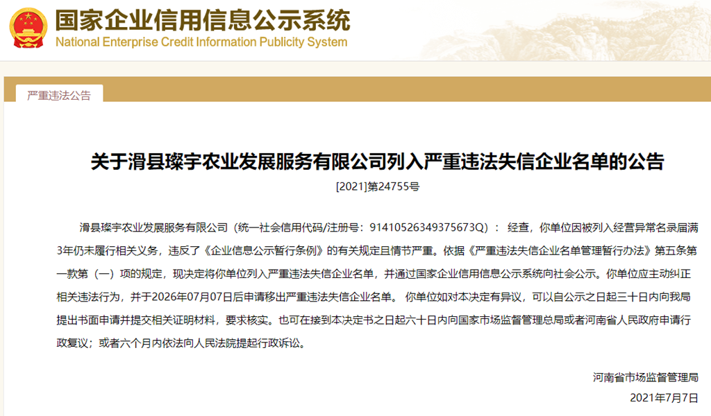 中國質量新聞網訊 從國家企業信用信息公示系統獲悉,2021年7月7日,河南省市場監督管理局發布關于滑縣璨宇農業發展服務有限公司列入嚴重違法失信企業名單公告([2021]第24755號)。