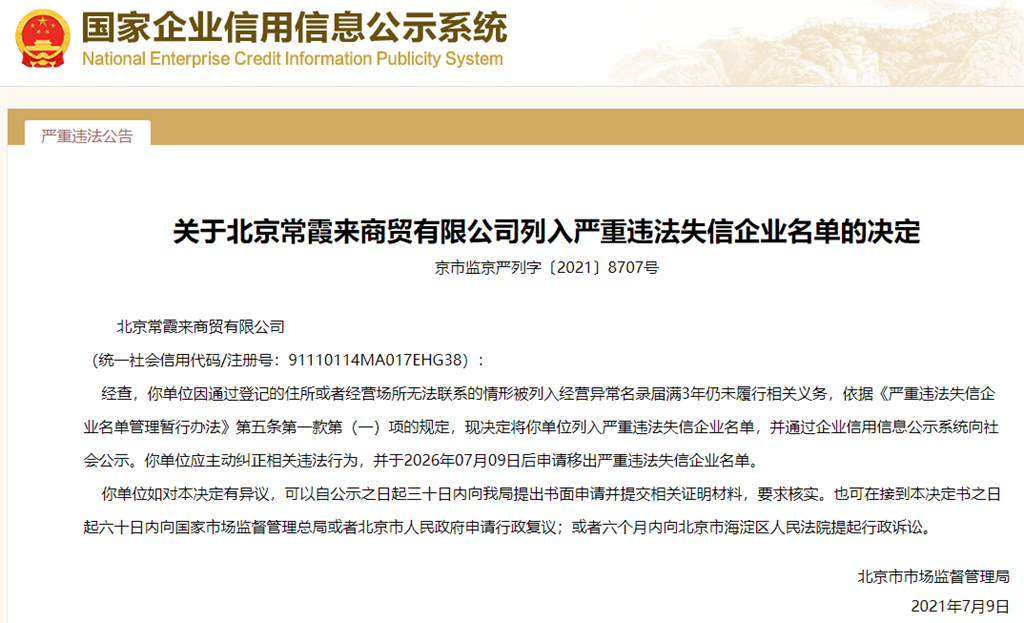 中國質量新聞網訊 從國家企業信用信息公示系統獲悉,2021年7月9日,北京市市場監督管理局發布關于北京常霞來商貿有限公司列入嚴重違法失信企業名單的決定(京市監京嚴列字〔2021〕8707號)。
