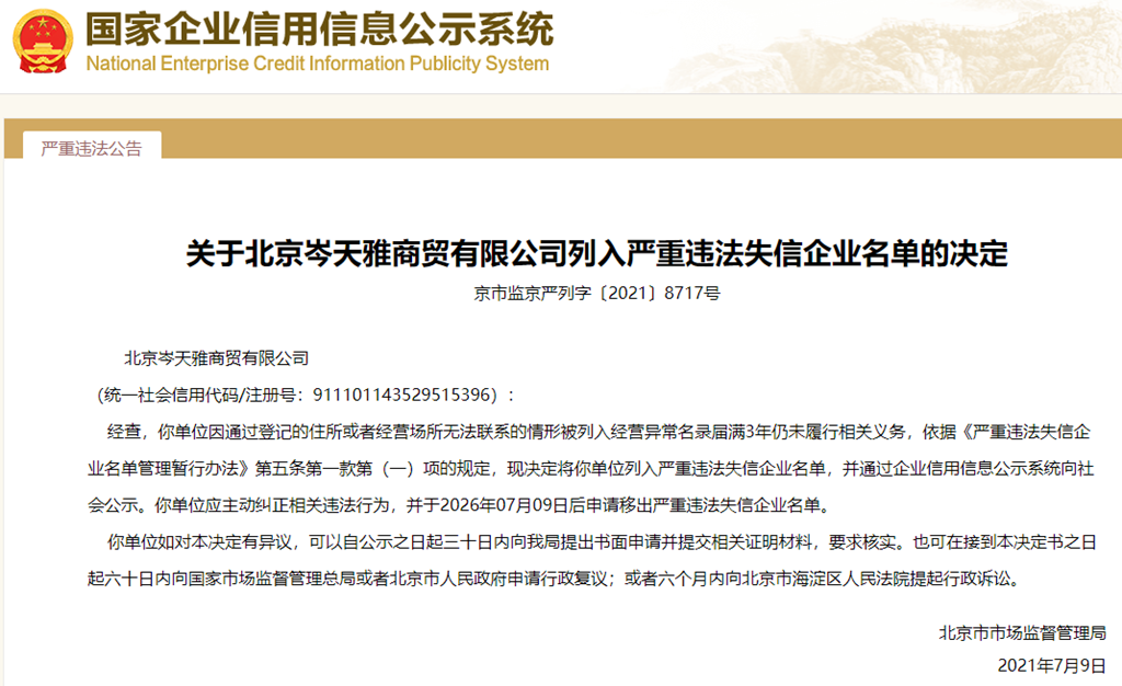 北京岑天雅商貿有限公司列入嚴重違法失信企業名單