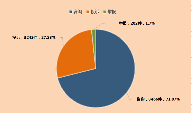 其中受理咨詢8466件、投訴3243件、舉報202件,分別占受理總量的71.07%、27.23%、1.7%。為消費者挽回經濟損失577.78萬元,投訴和舉報的法定時限辦結率為100%。(見圖一)。