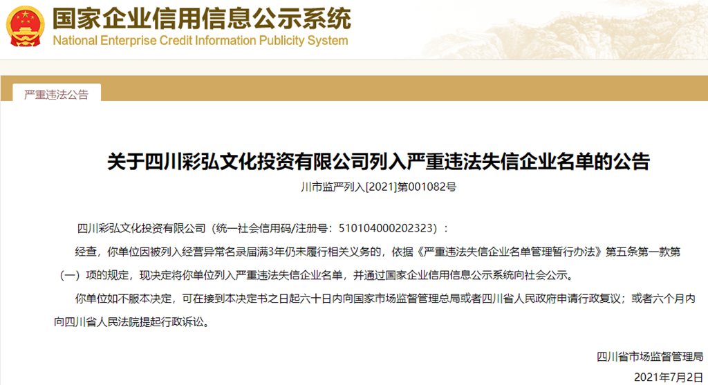 中國質量新聞網訊 從國家企業信用信息公示系統獲悉,2021年7月2日,四川省市場監督管理局發布關于四川彩弘文化投資有限公司列入嚴重違法失信企業名單的公告(川市監嚴列入[2021]第001082號)。