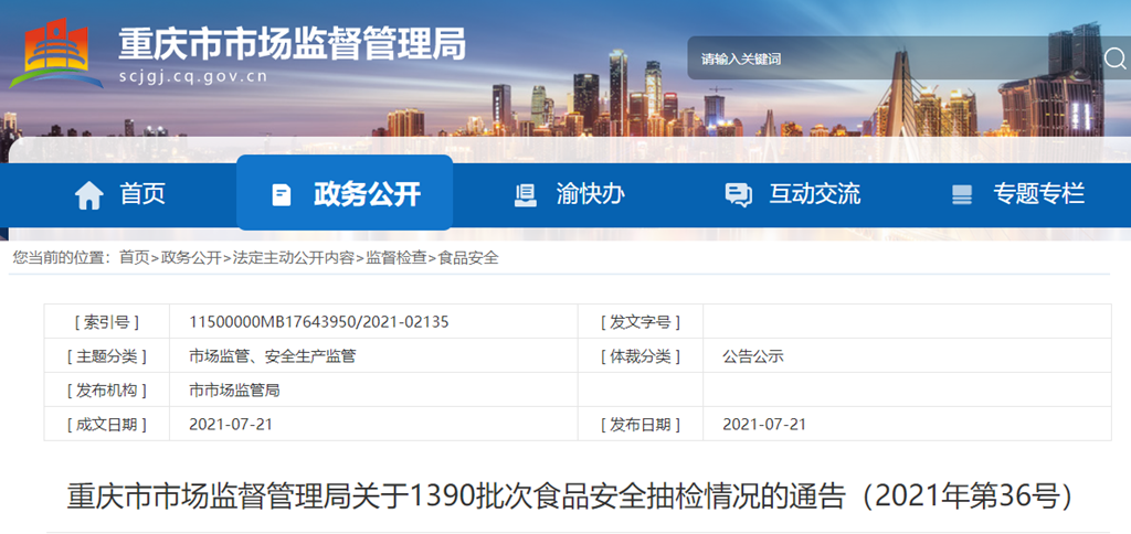 中國質(zhì)量新聞網(wǎng)訊 近期,重慶市市場監(jiān)督管理局組織抽檢餅干、餐飲食品、茶葉及相關(guān)制品、炒貨食品及堅果制品、淀粉及淀粉制品、豆制品、方便食品、糕點、酒類、糧食加工品、肉制品、乳制品、食糖、食用農(nóng)產(chǎn)品、食用油、油脂及其制品、蔬菜制品、薯類和膨化食品、速凍食品、糖果制品、調(diào)味品、飲料等21類食品1390批次樣品。抽樣檢驗項目合格樣品1361批次,不合格樣品29批次。檢測項目見附件。根據(jù)食品安全國家標(biāo)準(zhǔn),個別項目不合格,其產(chǎn)品即判定為不合格產(chǎn)品。詳情如下: