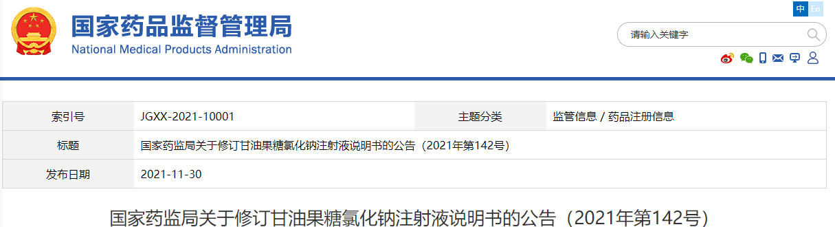 根據藥品不良反應評估結果,為進一步保障公眾用藥安全,國家藥品監督管理局決定對甘油果糖氯化鈉注射液說明書的內容進行統一修訂?,F將有關事項公告如下: