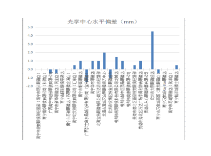 2.光學中心水平偏差。國家標準是根據頂焦度值大小來確定光學中心水平偏差允差大小,本次比較試驗的樣品光學中心水平距離允差要求均在±2.00mm,差值的絕對值越接近零,表示產品質量越好。經檢驗,欽州市大明眼鏡總店的樣品光學中心水平偏差不符合國家標準。