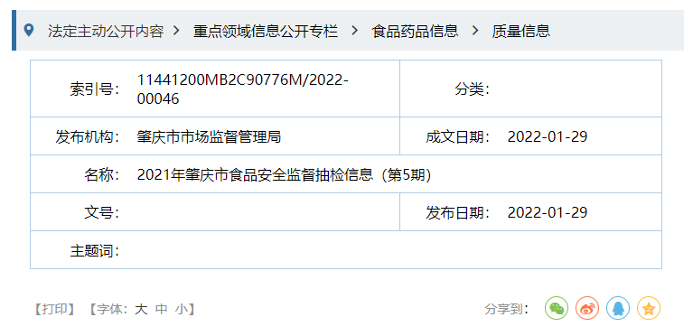 中國質量新聞網訊 近日,廣東省肇慶市市場監管局發布2021年食品安全監督抽檢信息(第5期)。本期檢出2批次調味品不合格。