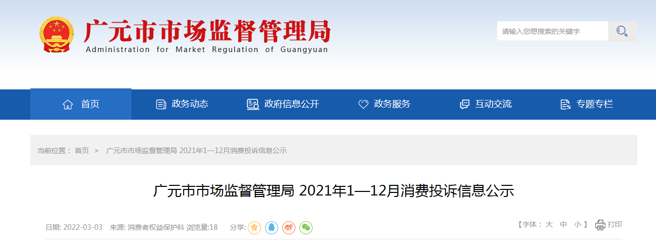 中國質(zhì)量新聞網(wǎng)訊 3月3日,四川省廣元市市場監(jiān)管局網(wǎng)站公示2021年1—12月消費投訴信息。消費投訴舉報較集中主體涉及四川省青川縣川珍實業(yè)有限公司、利州區(qū)老鳳祥(黃金珠寶)店鋪等。