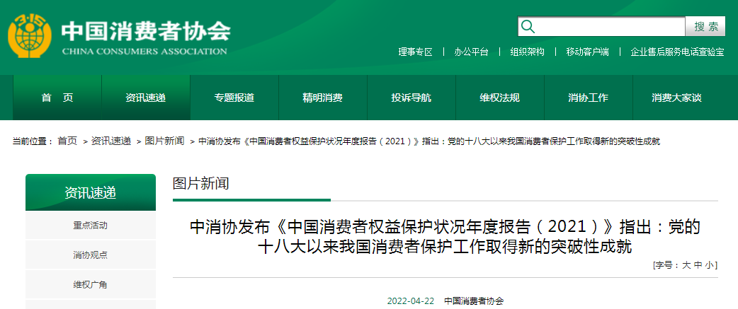 中消協發布《中國消費者權益保護狀況年度報告(2021)》指出:黨的十八大以來我國消費者保護工作取得新的突破性成就