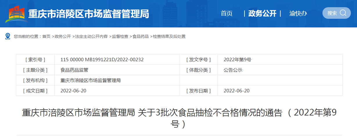 中國質量新聞網訊 2022年6月20日,重慶市涪陵區市場監督管理局網站發布2022年第9號食品抽檢信息。本次檢出1批次白酒(純和玉米酒)不合格。
