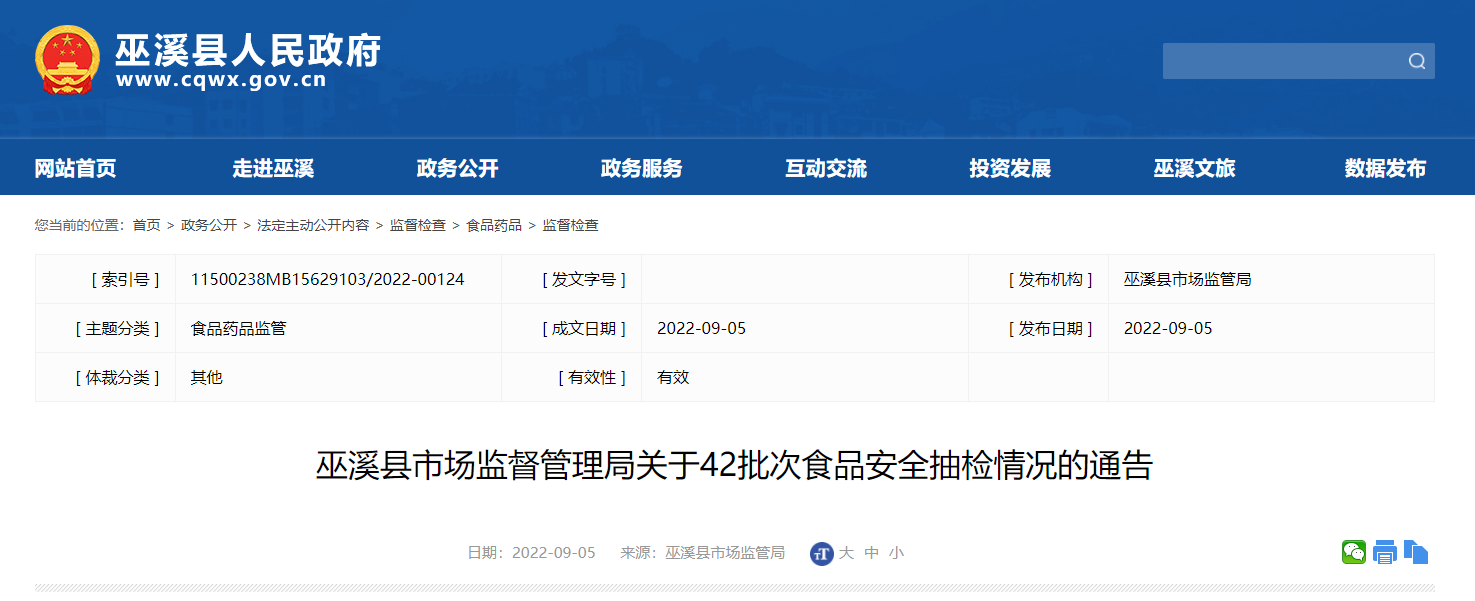 中國質(zhì)量新聞網(wǎng)訊 9月5日,重慶市巫溪縣市場監(jiān)督管理局發(fā)布關(guān)于42批次食品安全抽檢情況的通告(2022年第11號(hào))。通告稱,近期,該局組織抽檢食用農(nóng)產(chǎn)品42批次樣品。抽樣檢驗(yàn)項(xiàng)目合格樣品42批次,不合格樣品0批次。