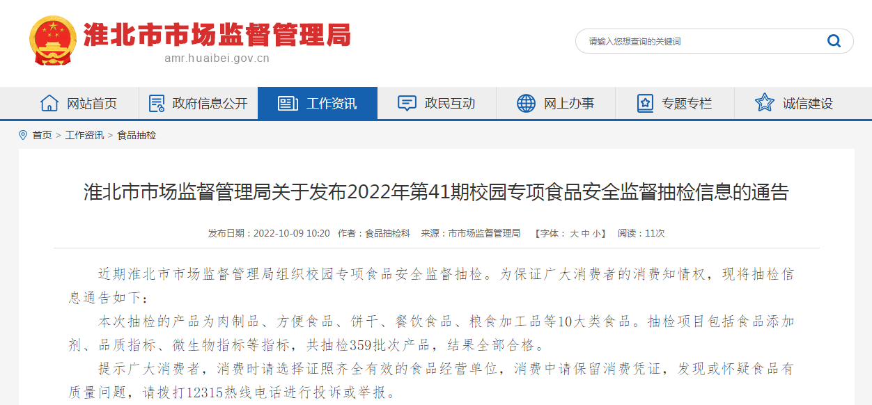 中國質量新聞網訊 10月9日,安徽省淮北市市場監督管理局網站發布2022年第41期校園專項食品安全監督抽檢信息。本期抽檢125批次方便食品,檢驗結果為合格。
