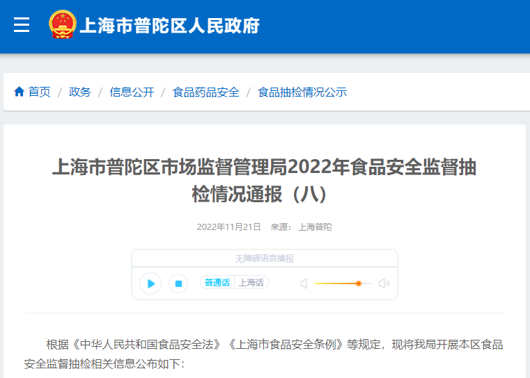 中國質(zhì)量新聞網(wǎng)訊 近日,上海市普陀區(qū)市場監(jiān)督管理局通報2022年食品安全監(jiān)督抽檢情況(八)。本次監(jiān)督抽檢信息涉及二十六大類食品,包括:餐飲食品、食用農(nóng)產(chǎn)品、食用油、油脂及其制品、糧食加工品、肉制品、乳制品、速凍食品等。抽檢樣品共計876批次,其中合格865批次,不合格11批次,其中不合格樣品如被抽檢人提出復檢的,以復檢結(jié)果為準。