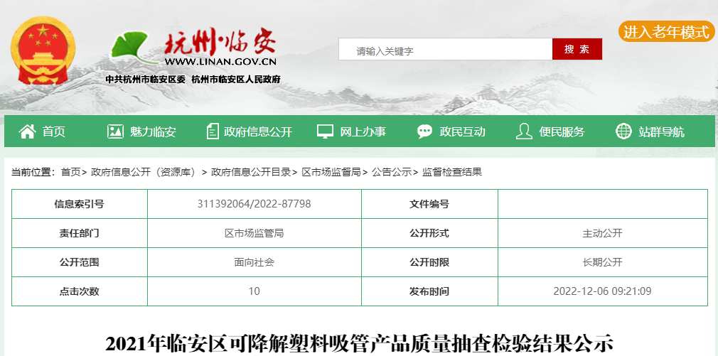 中國質量新聞網訊 2022年12月6日,杭州市臨安區人民政府網站公示2021年可降解塑料吸管產品質量抽查檢驗結果。