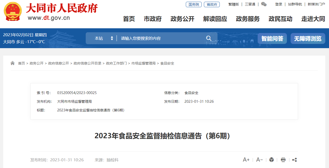 | DC22140200915634923 | 1 | 太原酒廠有限責任公司 | 太原市杏花嶺區大東關街12號 | 大同市平城區快客超市東信店 | 山西 | 晉泉高粱白酒 | 500ml45%voI/瓶 | 2022-04-01 | 酒類 | 2023年第6期 | 2023年1月31日 | 大同市市場監督管理局/你點我檢專項抽檢 | / |