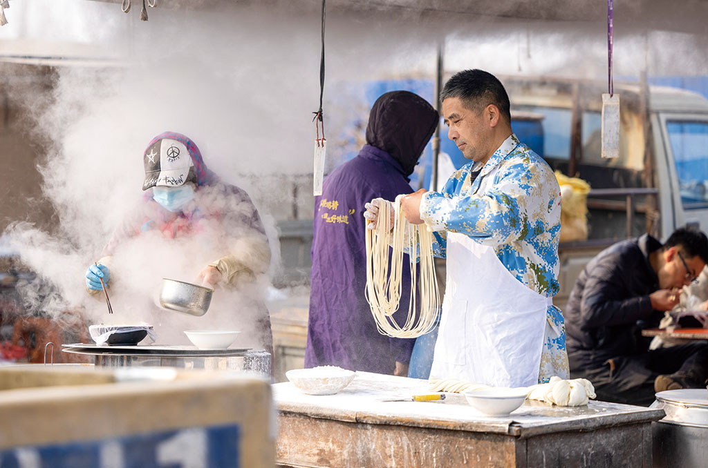 河北省唐山市豐南區大新莊鎮大集的商販在制作拉面。李秀清 攝