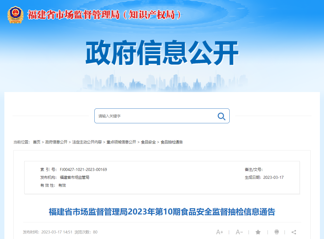 中國質量新聞網訊 2023年3月17日,福建省市場監督管理局發布2023年第10期食品安全監督抽檢信息通告。