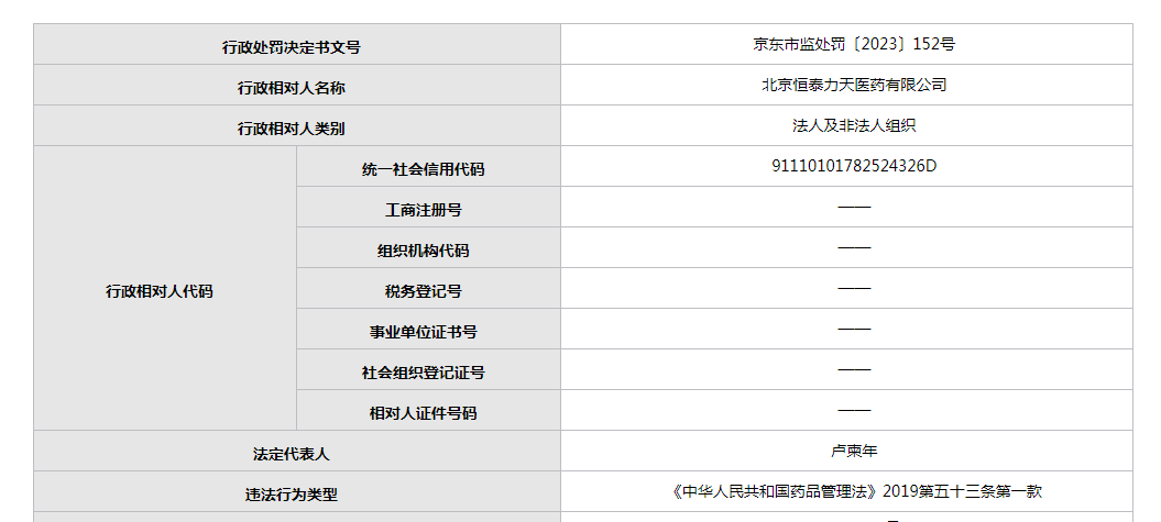 行政處罰決定書顯示,違法事實為:北京恒泰力天醫藥有限公司未遵守藥品經營質量管理規范,逾期不改的行為,涉嫌違反了《中華人民共和國藥品管理法》第五十三條第一款規定。依據《中華人民共和國藥品管理法》2019第一百二十六條規定,北京市東城區市場監督管理局對該公司罰款100000元并責令其改正上述違法行為。