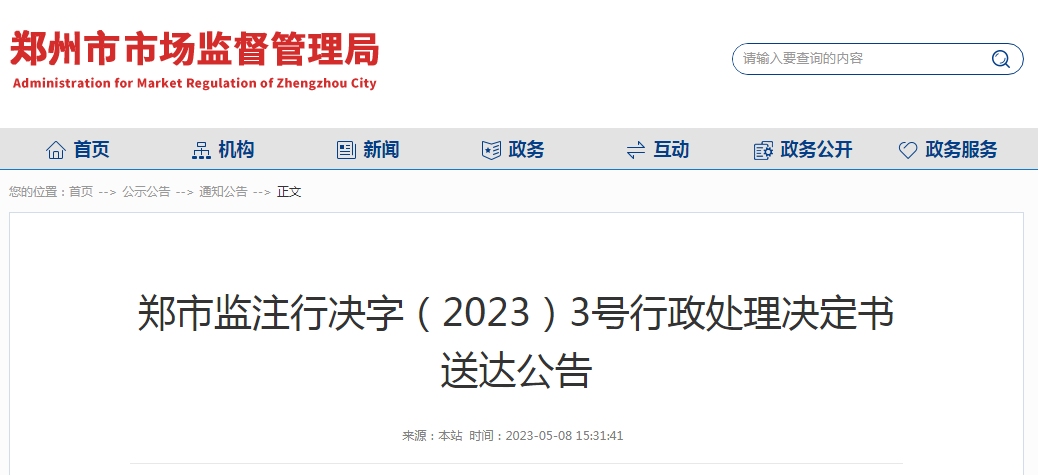 鄭州市市場監(jiān)督管理局行政處理文書送達公告