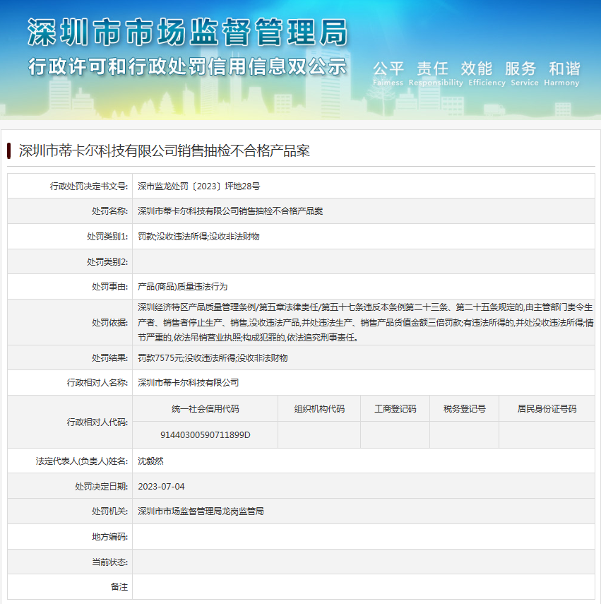 中國(guó)質(zhì)量新聞網(wǎng)訊 近日,深圳市市場(chǎng)監(jiān)督管理局龍崗監(jiān)管局發(fā)布行政處罰信息(深市監(jiān)龍?zhí)幜P〔2023〕坪地28號(hào)),涉及深圳市蒂卡爾科技有限公司銷售抽檢不合格產(chǎn)品案。