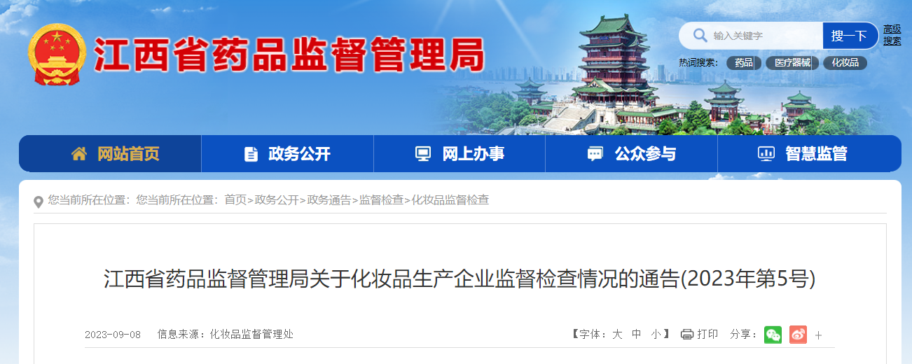 中國質量新聞網訊 9月8日,江西省藥品監督管理局網站發布關于化妝品生產企業監督檢查情況的通告(2023年第5號)。