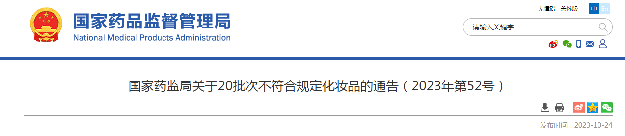 中國(guó)質(zhì)量新聞網(wǎng)訊 10月24日,國(guó)家藥監(jiān)局網(wǎng)站發(fā)布關(guān)于20批次不符合規(guī)定化妝品的通告(2023年第52號(hào))。通告稱,在2023年國(guó)家化妝品抽樣檢驗(yàn)工作中,經(jīng)青海省藥品檢驗(yàn)檢測(cè)院等單位檢驗(yàn),產(chǎn)品標(biāo)簽標(biāo)示為廣州市凱秀化妝品有限公司生產(chǎn)的巧迪慧爾草本海藻面膜等20批次化妝品不符合規(guī)定。