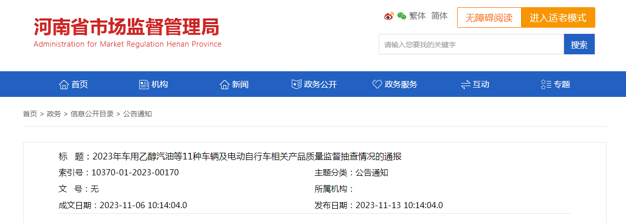 中國質量新聞網訊 11月13日,河南省市場監督管理局網站通報2023年車用乙醇汽油等11種車輛及電動自行車相關產品質量監督抽查情況。