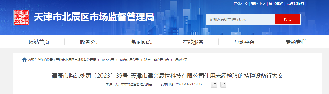 中國質量新聞網訊 近日,天津市北辰區市場監督管理局發布行政處罰決定書(津辰市監綜處罰〔2023〕39號),涉及天津市津興晟世科技有限公司使用未經檢驗的特種設備行為案。