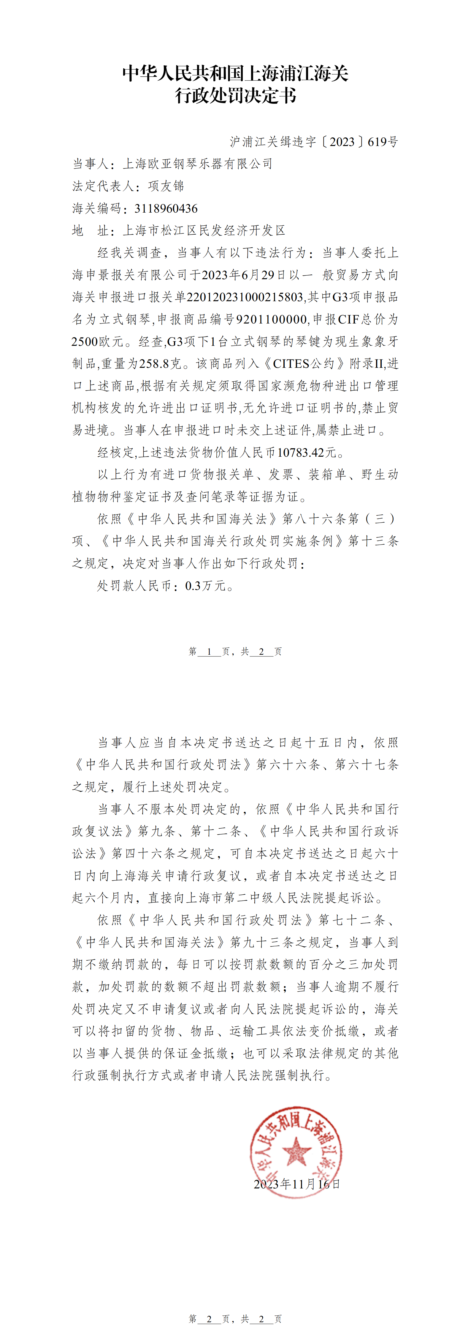 中華人民共和國(guó)上海浦江海關(guān)關(guān)于上海歐亞鋼琴樂器有限公司涉證行政處罰決定書(滬浦江關(guān)緝違字[2023]619號(hào)).pdf