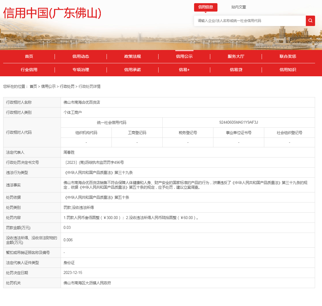 佛山市南海合優百貨店銷售不符合保障人體健康和人身、財產安全的國家標準的產品案