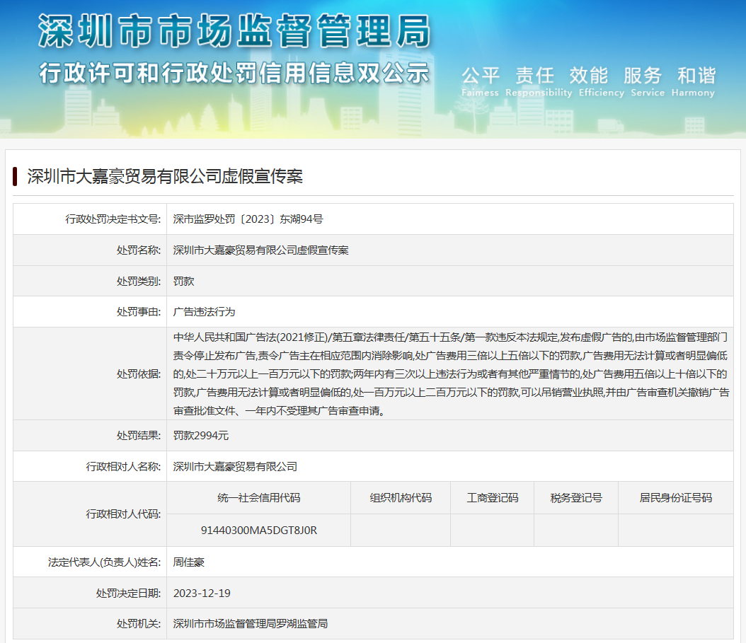 深圳市大嘉豪貿(mào)易有限公司虛假宣傳案