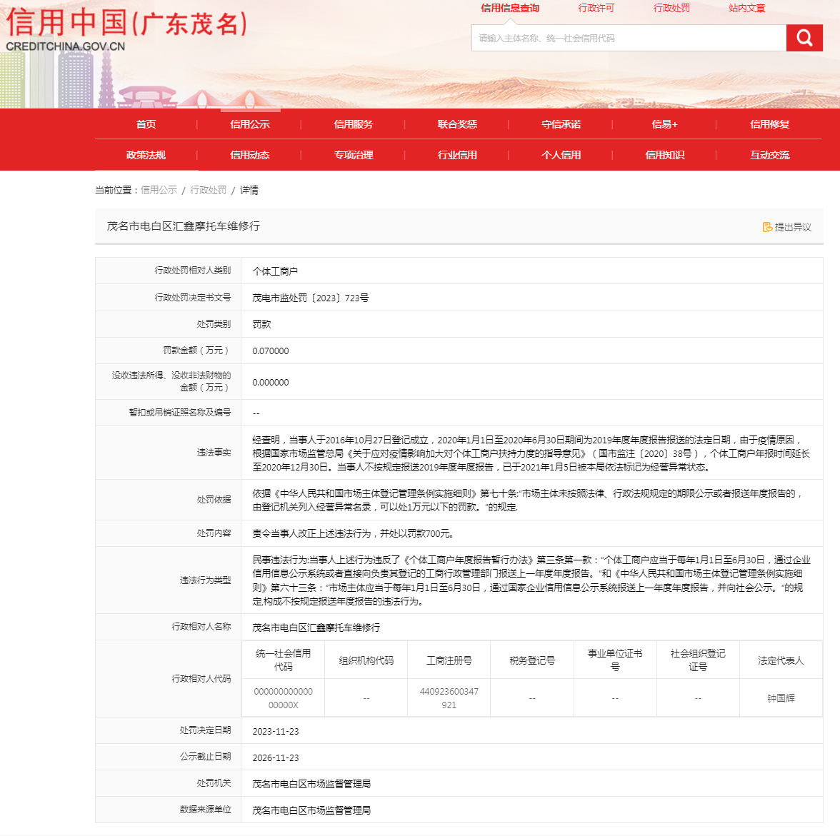 茂名市電白區匯鑫摩托車維修行未按規定報送年度報告案