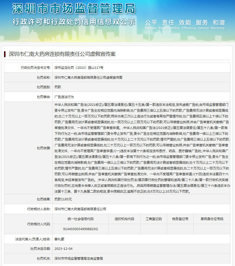 深圳市仁南大藥房連鎖有限責任公司虛假宣傳案