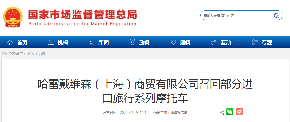 日前,哈雷戴維森(上海)商貿(mào)有限公司根據(jù)《缺陷汽車產(chǎn)品召回管理?xiàng)l例》和《缺陷汽車產(chǎn)品召回管理?xiàng)l例實(shí)施辦法》的要求,向國家市場監(jiān)督管理總局備案了召回計(jì)劃。自2024年2月28日起,召回2023年6月29日至2023年9月28日期間生產(chǎn)的部分進(jìn)口2023年款大道滑翔CVO旅行系列摩托車,共計(jì)67輛。