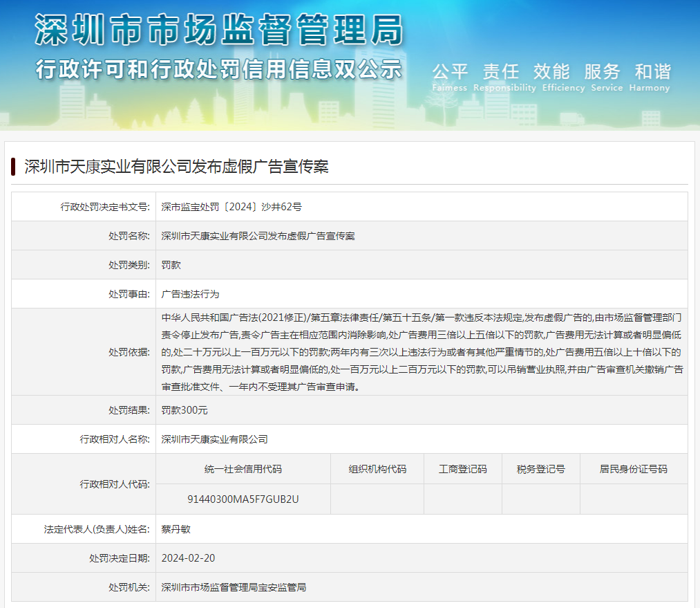 深圳市天康實業有限公司發布虛假廣告宣傳案
