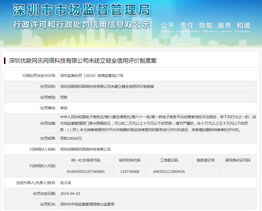 深圳優聯網訊網絡科技有限公司未建立健全信用評價制度案