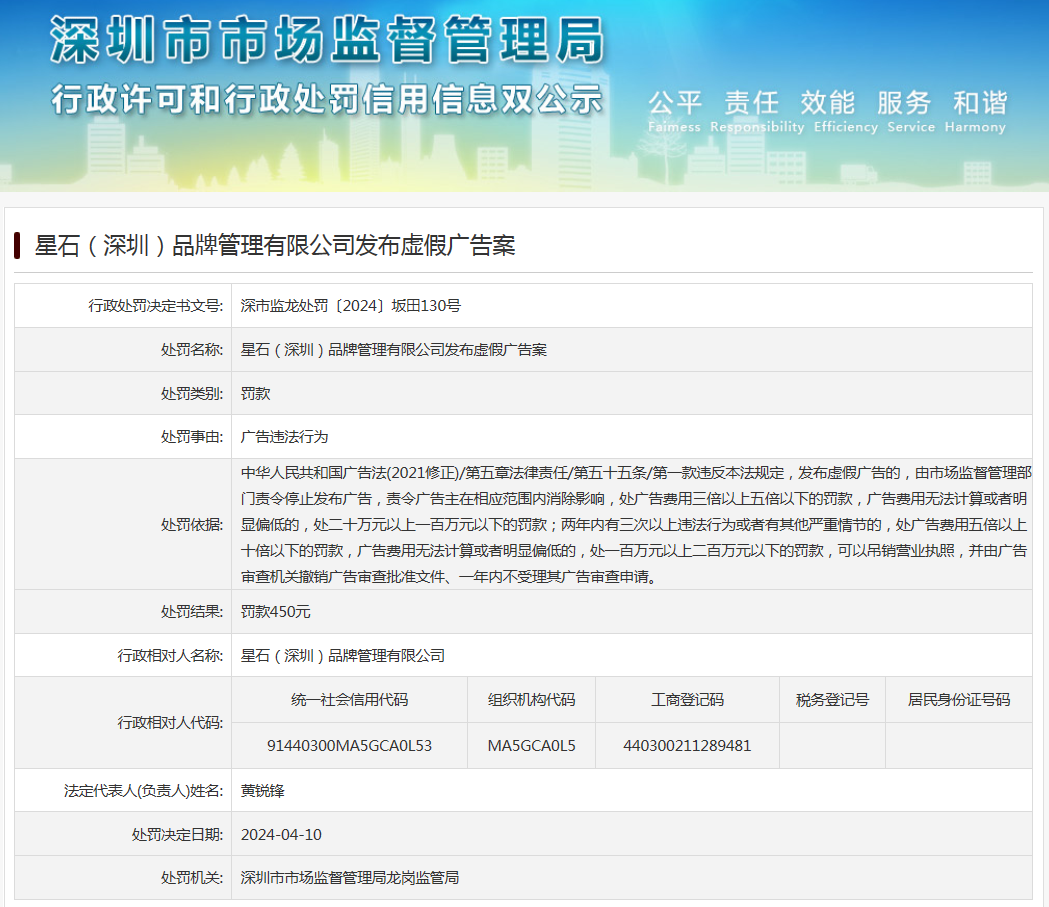 星石(深圳)品牌管理有限公司發布虛假廣告案