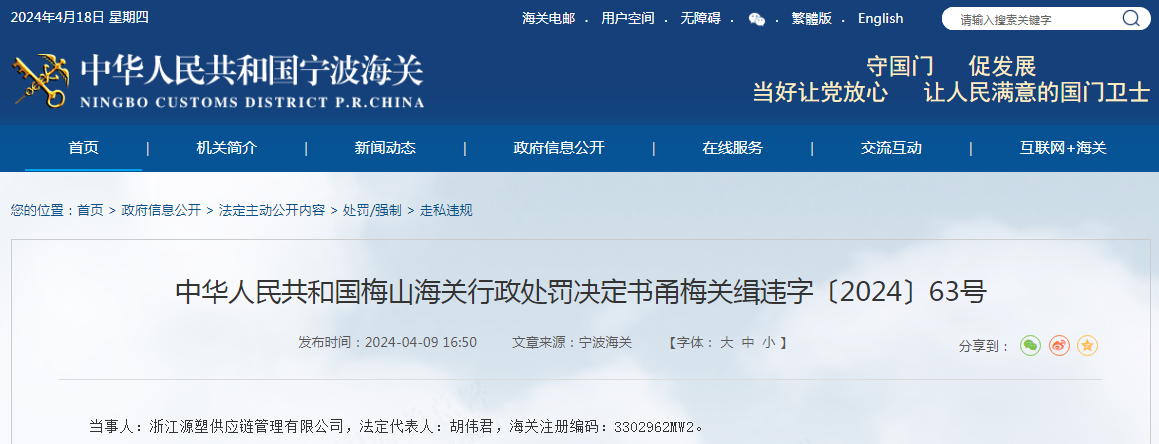當事人:浙江源塑供應鏈管理有限公司,法定代表人:胡偉君,海關注冊編碼:3302962MW2。