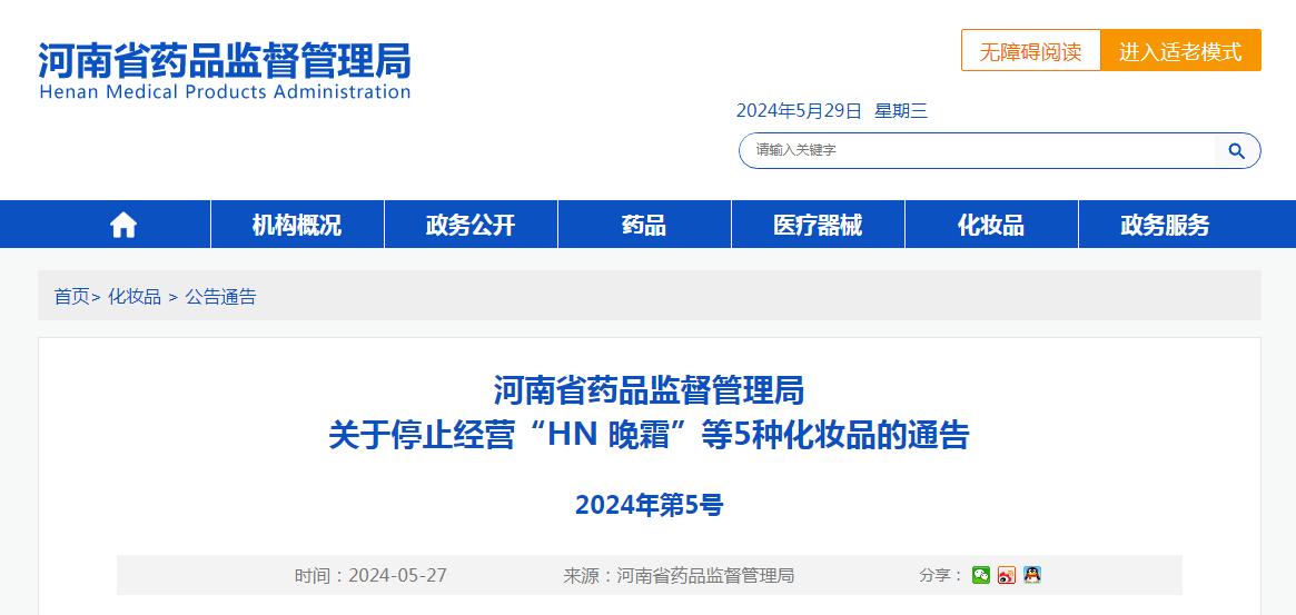 河南省藥品監督管理局關于停止經營“HN 晚霜”等5種化妝品的通告