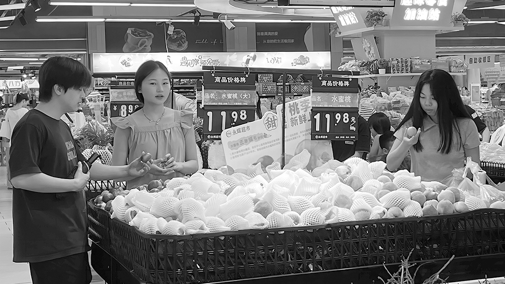 現在,桃子已成為不少消費者水果餐桌上的主角之一。重慶市不少超市趕在端午節到來前,上市新鮮的水蜜桃。圖為市民在超市選購新上市的桃子。本報記者 謝 旺 攝