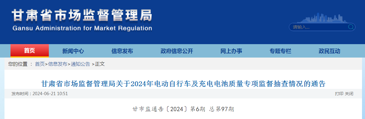 甘肅省市場(chǎng)監(jiān)督管理局關(guān)于2024年電動(dòng)自行車及充電電池質(zhì)量專項(xiàng)監(jiān)督抽查情況的通告
