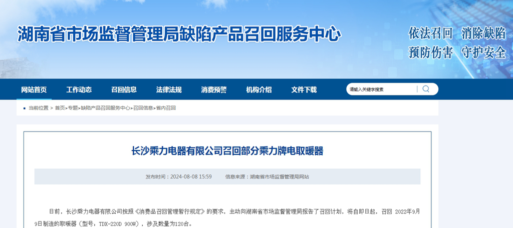 中國質量新聞網訊 據湖南省市場監督管理局缺陷產品召回服務中心網站8月8日消息,日前,長沙乘力電器有限公司按照《消費品召回管理暫行規定》的要求,主動向湖南省市場監督管理局報告了召回計劃,將自即日起,召回2022年9月9日制造的取暖器(型號:TDX-220D?900W),涉及數量為120臺。