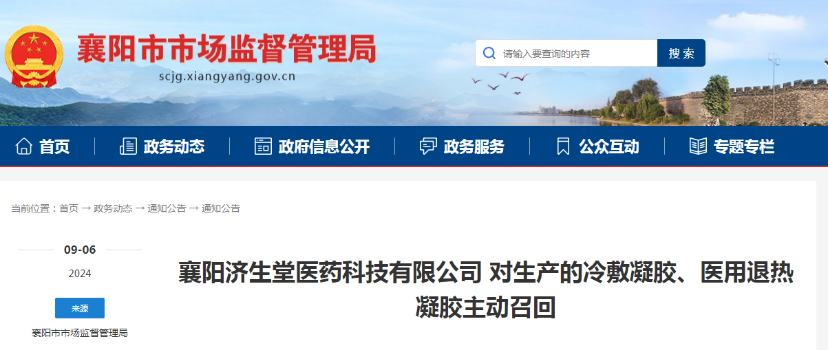 襄陽濟生堂醫藥科技有限公司對生產的冷敷凝膠、醫用退熱凝膠主動召回