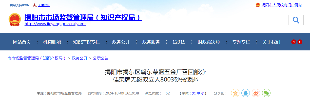 中國質量新聞網訊 據廣東省揭陽市市場監管局網站消息,日前,揭陽市揭東區磐東榮盛五金廠按照《消費品召回管理暫行規定》的要求,主動向揭陽市市場監督管理局報告了召回計劃,將自即日起,召回2023年8月至2024年3月期間制造的部分佳榮牌R8003-A05型號無磁雙立人8003砂光飯匙,涉及數量:300支。