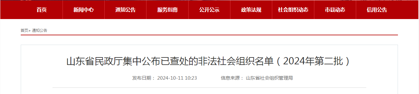 山東省民政廳集中公布已查處的非法社會組織名單(2024年第二批)