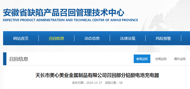 中國質(zhì)量新聞網(wǎng)訊 據(jù)安徽省缺陷產(chǎn)品召回管理技術(shù)中心網(wǎng)站消息,日前,天長市美心美業(yè)金屬制品有限公司按照《消費(fèi)品召回管理暫行規(guī)定》的要求,向安徽省市場監(jiān)督管理局、滁州市市場監(jiān)督管理局報(bào)告了召回計(jì)劃,將自即日起,召回2023年6月30日生產(chǎn)的MG48V20Ah鉛酸電池充電器,涉及數(shù)量為800只。