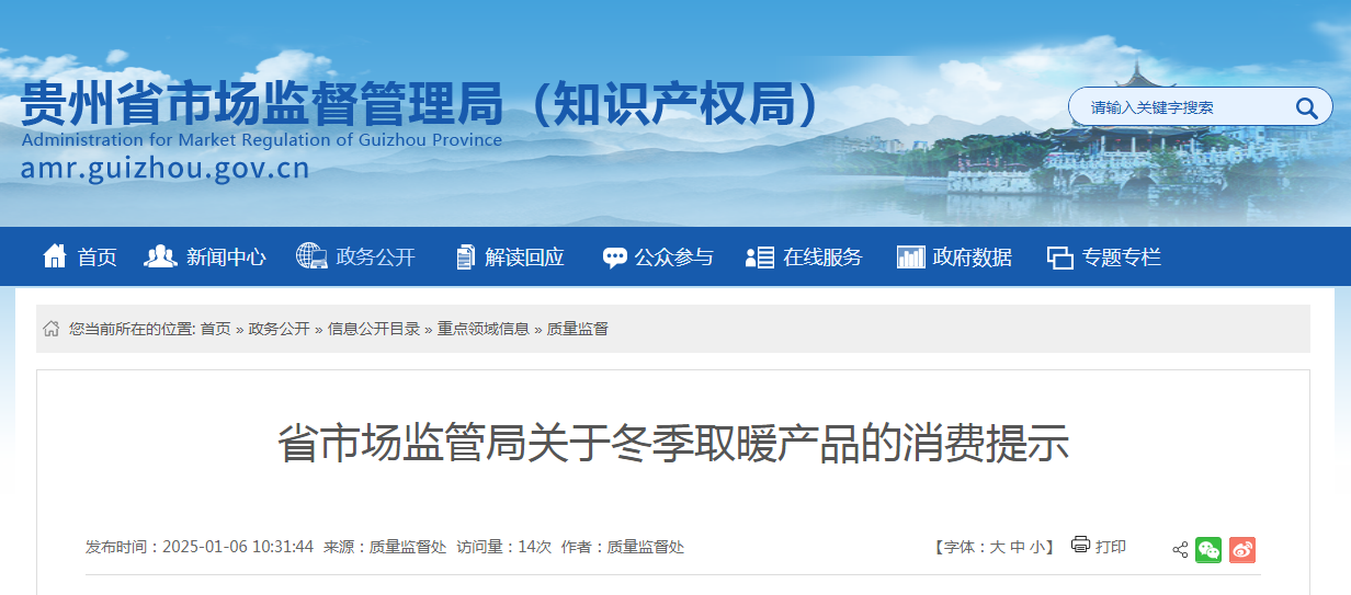 寒冬時節,室內加熱器、電熱毯、電熱暖手器等取暖產品成為季節消費熱點。為保障廣大消費者合法權益,避免選購不當或使用不規范引發漏電、燙傷、火災等安全事故發生,貴州省市場監督管理局特發布冬季取暖產品消費提示,提醒消費者合理選購、安全使用。