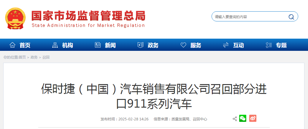 日前,保時(shí)捷(中國(guó))汽車銷售有限公司根據(jù)《缺陷汽車產(chǎn)品召回管理?xiàng)l例》和《缺陷汽車產(chǎn)品召回管理?xiàng)l例實(shí)施辦法》的要求,向國(guó)家市場(chǎng)監(jiān)督管理總局備案了召回計(jì)劃。決定自2025年3月1日起,召回2023年2月16日至2023年7月19日期間生產(chǎn)的911系列汽車,共計(jì)190輛。
