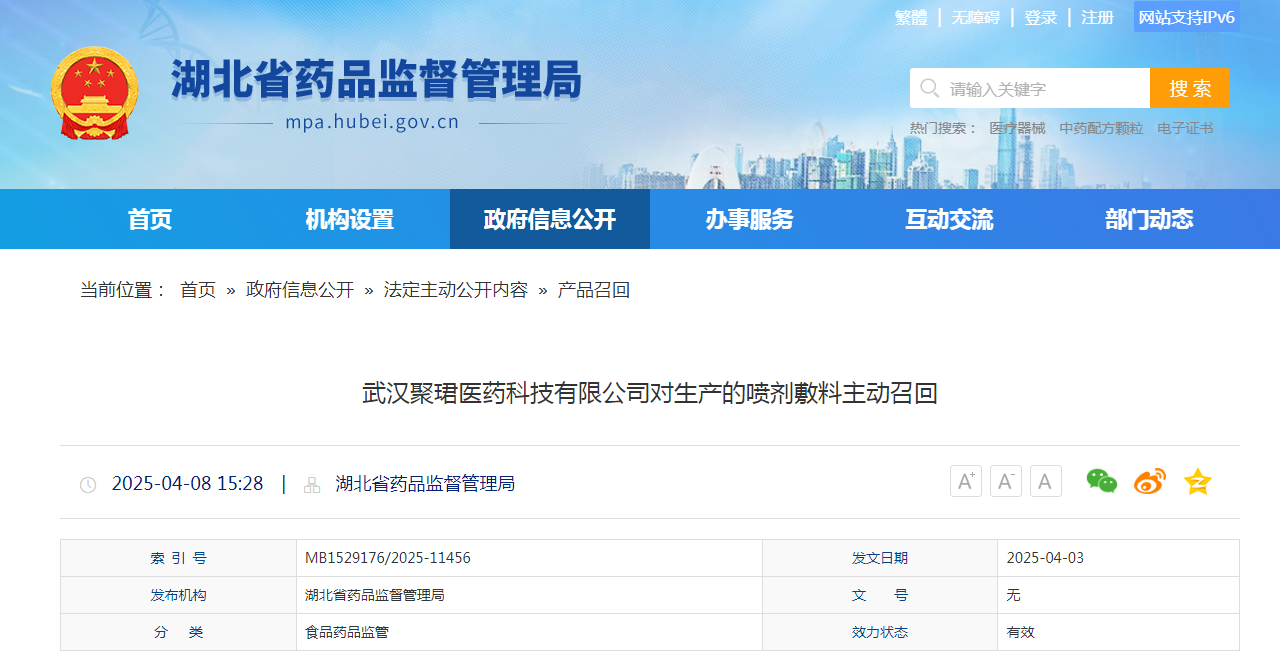 武漢聚珺醫藥科技有限公司報告,由于實物與備案資料不一致、標簽、說明書內容與備案資料不一致,商標注冊名:重組人干擾素違反了《商標法》等原因,武漢聚珺醫藥科技有限公司對其生產的噴劑敷料(備案號:鄂漢械備20191465號)主動召回。召回級別為三級。涉及產品的型號、規格及批次等詳細信息見《醫療器械召回事件報告表》。