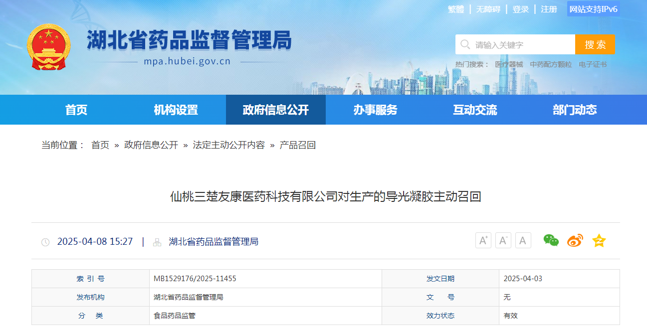 仙桃三楚友康醫藥科技有限公司報告,由于產品說明書和備案說明書不一致等原因,仙桃三楚友康醫藥科技有限公司對其生產的導光凝膠(備案號:鄂仙桃械備20230039)主動召回。召回級別為三級。涉及產品的型號、規格及批次等詳細信息見《醫療器械召回事件報告表》。