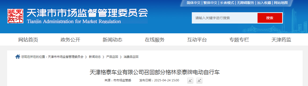 中國質量新聞網訊 據天津市市場監管委網站消息,日前,天津格泰車業有限公司按照《消費品召回管理暫行規定》的要求,主動向天津市市場監督管理委員會報告了召回計劃,將自即日起,召回2024年4月2日制造的格林豪泰牌TDT078Z型號電動自行車,涉及數量為60輛;2024年6月11日制造的格林豪泰牌TDT078Z型號電動自行車,涉及數量為80輛;以及2024年7月4日制造的格林豪泰牌TDT078Z型號電動自行車,涉及數量為80輛,共計涉及數量為220輛。
