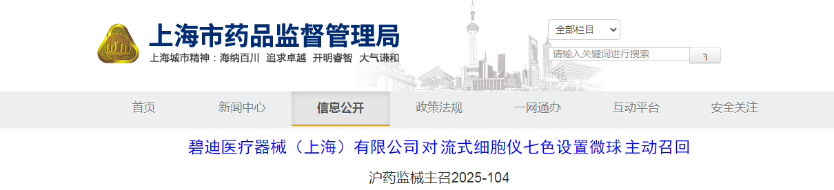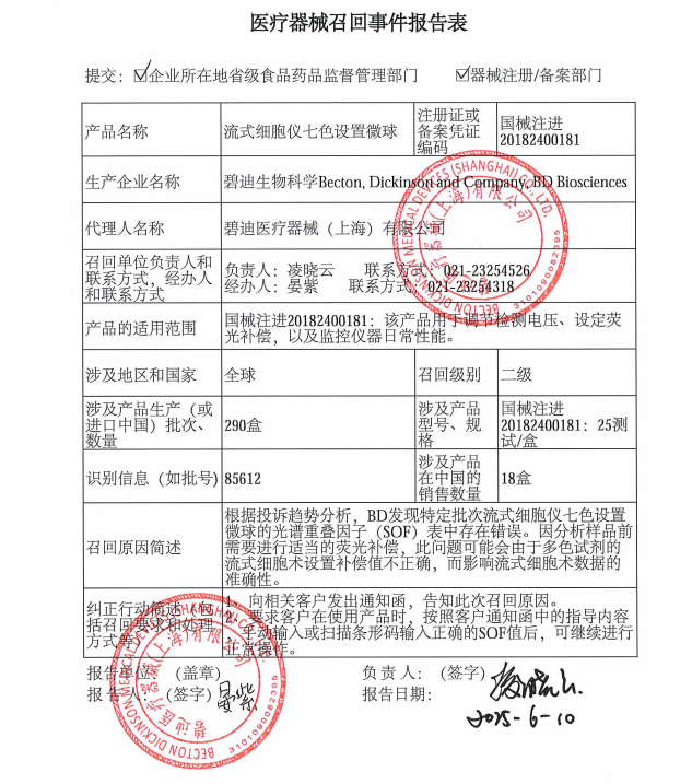 碧迪醫療器械(上海)有限公司對流式細胞儀七色設置微球主動召回